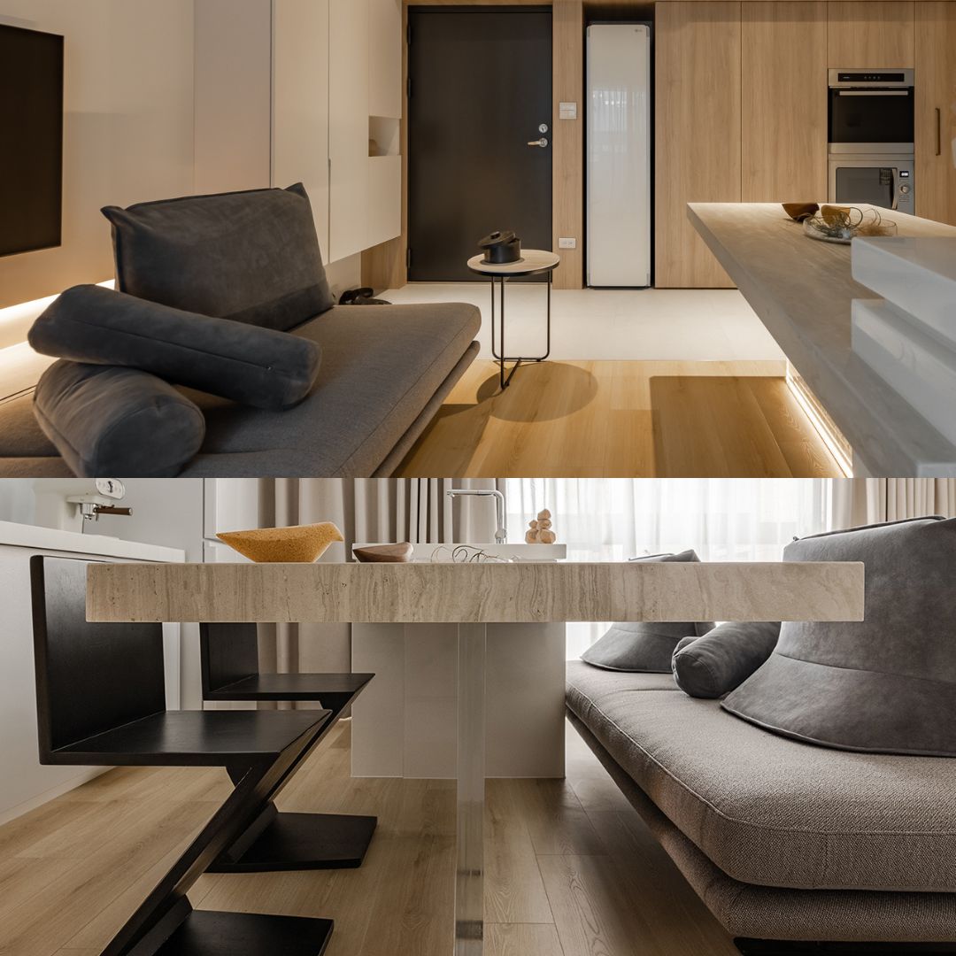 灰色調的中性軟裝與實木家具完美搭配,透過布料與選材,軟糯的椅裝沙發與實木家具的原始之美,營造柔和舒適的氛圍,忙碌中抽離享受深層的放鬆與休息。