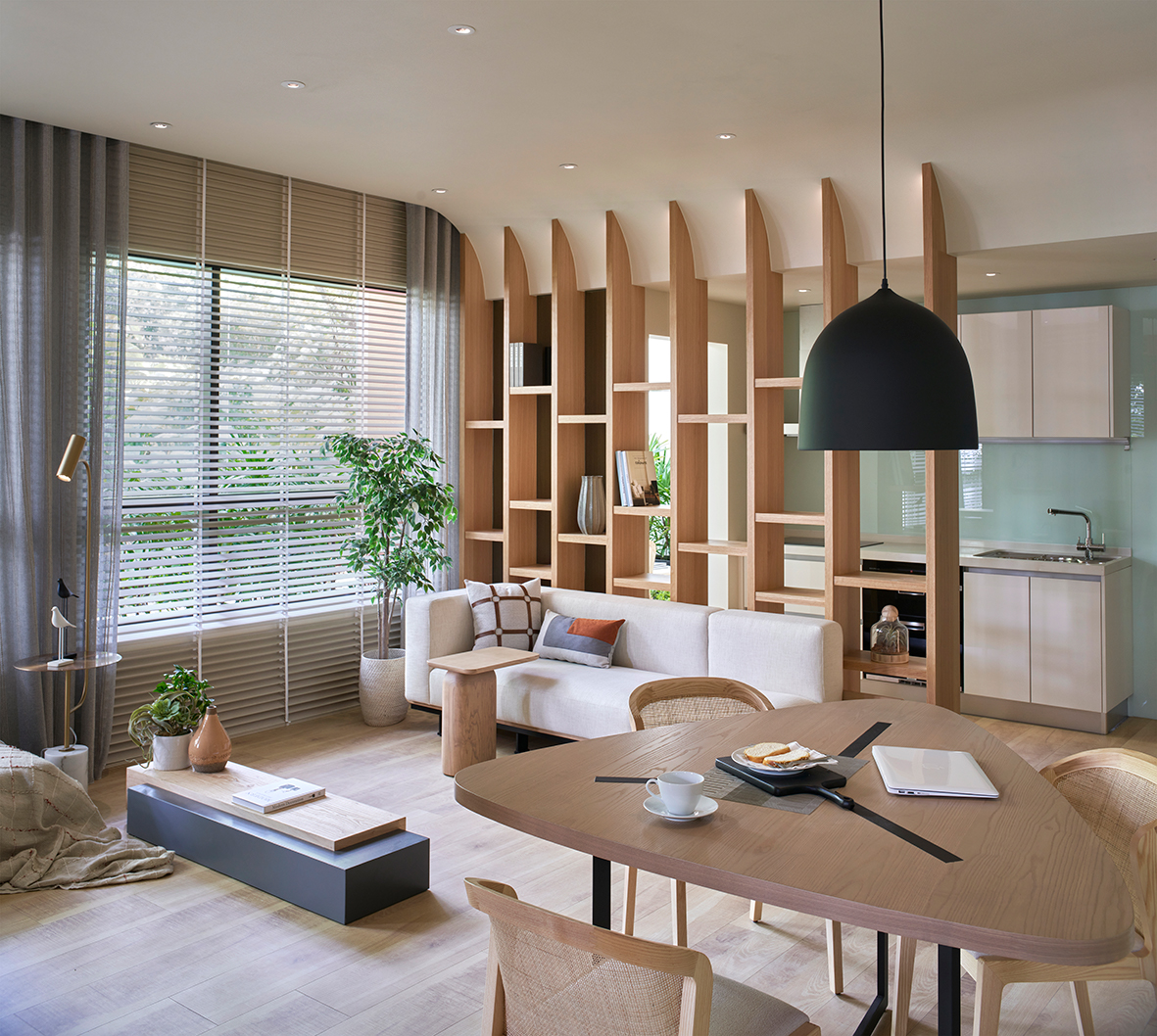 「餐桌與木地板相連,打造一個開放式三廳的功能空間,利用建築中空位引入外部充足的陽光,載重上喜歡的綠植把自然引入室内,可以享受陽光的休閒區。」