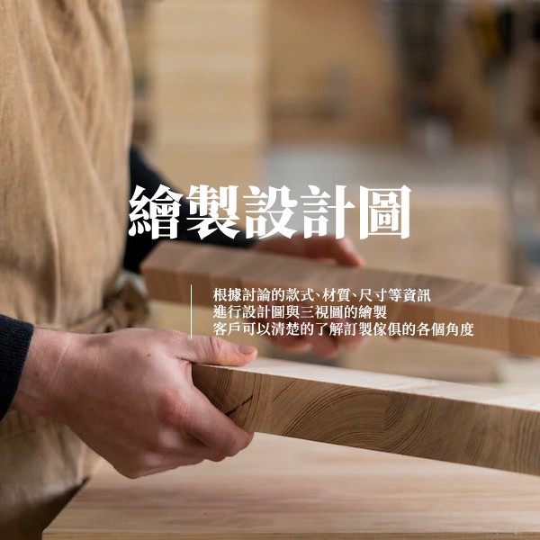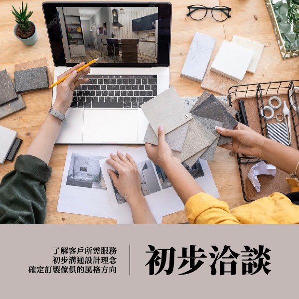 通常您找上我們,將會為您打造生產流程,全屋訂製傢俱配置、材質清單、選樣、調色、細緻度視覺體驗、形體調整、油漆色度、成品圖示溝通選擇、成品。中途有團隊全程指導把關