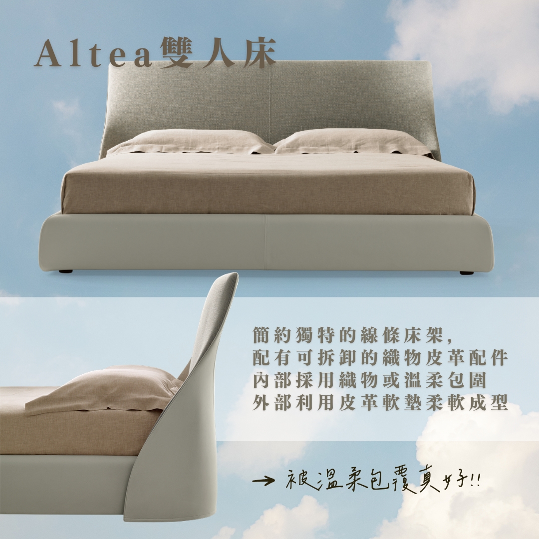 由簡約靈活的獨特的線條為設計的純手工雙人床,外部配有可拆卸的織物及皮革軟墊,一種或兩種顏色的和諧配置,內部採以織物或皮革軟墊,讓你在休息的夜,溫柔包覆著你。